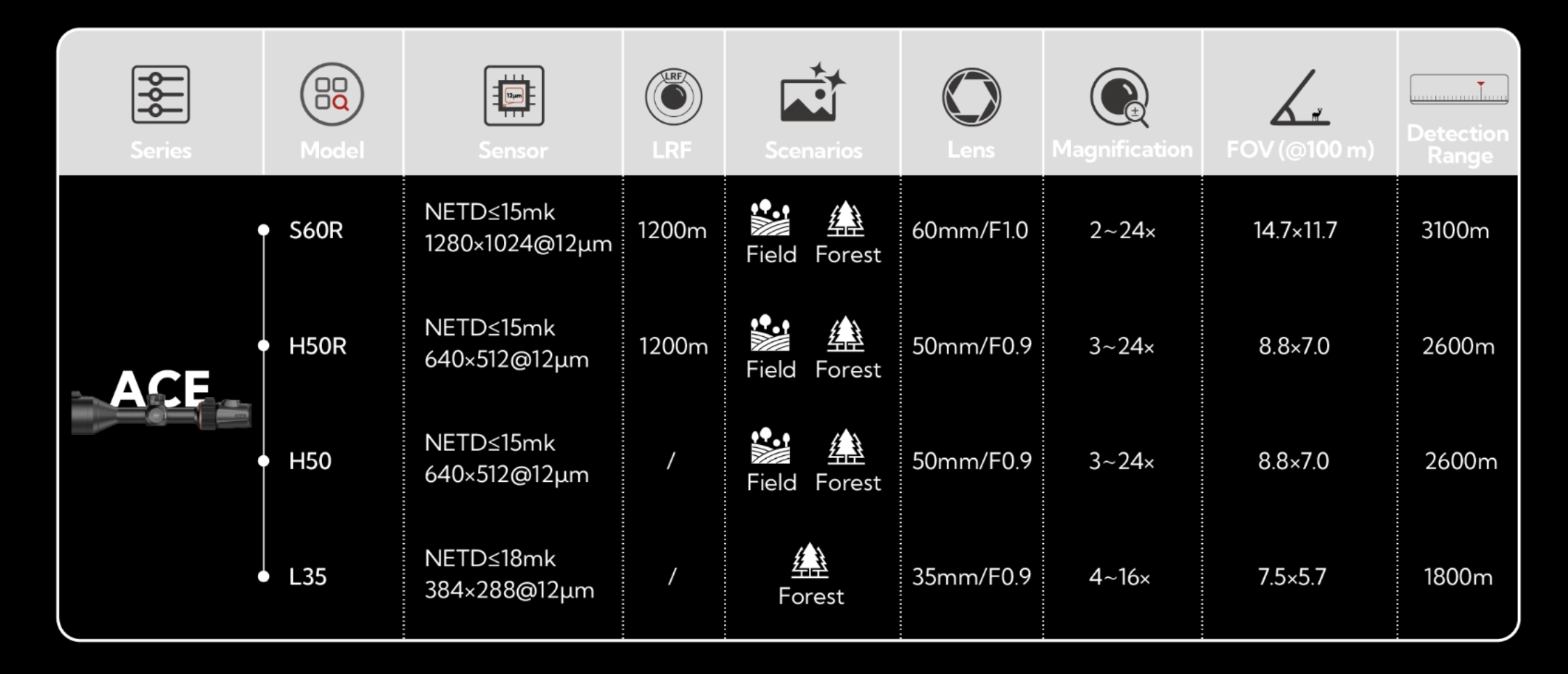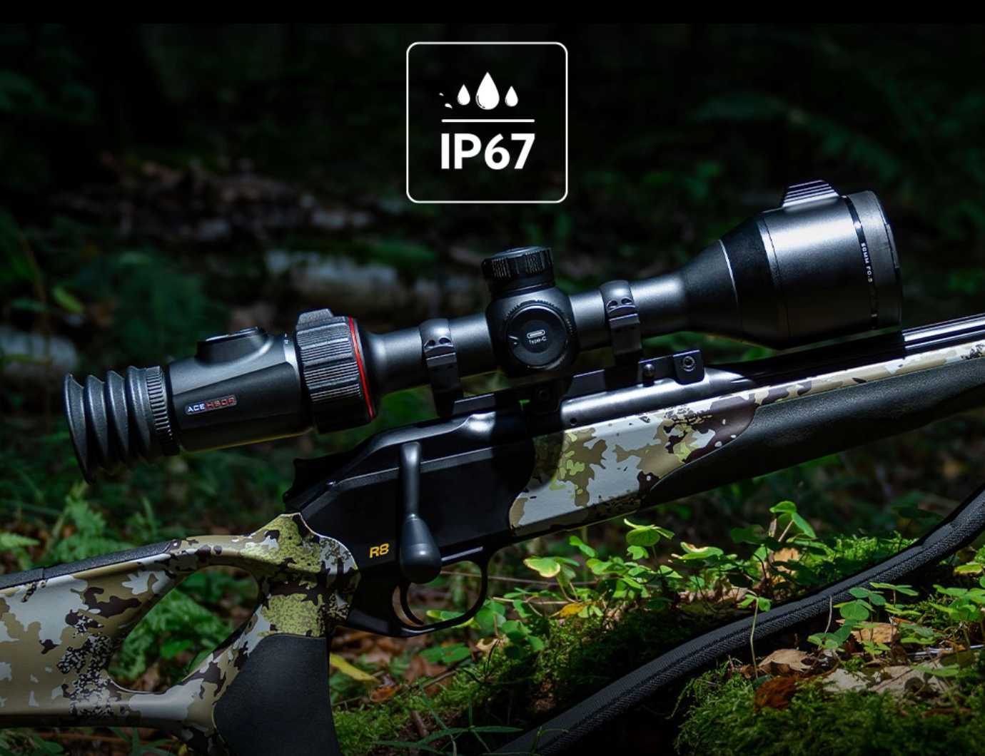 O ACE inclui recursos essenciais para cenários de caça, como cálculos balísticos, desligamento automático da tela, gravação de vídeo ativada por recuo e um design sem obturador, tornando possível uma caça perfeita.